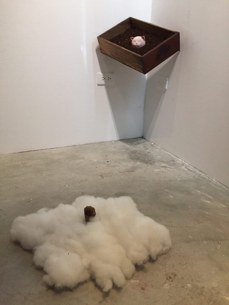 你覺得照片中這個作品想表達什麼呢?一隻貓掌伸出雲端,一顆貓頭探出土壤。用「場景」的概念來思考,已經超出「五感」的範圍了。有時候,你要用情感層面,甚至是第六感來體會。