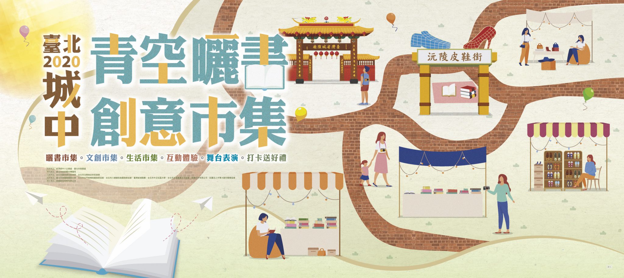 因應「大城中戶外百貨」的活動概念,先繪製出蜿蜒的街道,再將主題「市集」攤位繪製在道路交錯的空白處,藉以展現「戶外」的概念。由於活動涉及四個商業街區(重南書街、沅陵皮鞋街、北門相機商圈、臺灣省城隍廟),因此市集圖案除了書籍的意象外,尚在街區中放置各商圈的意象。由於主活動在沅陵街,因此將「沅陵皮鞋街」的字樣特別顯現出來。最後因為台北城中有著舊文化概念,因此色系刷淡,並且以磚褐色來進行線條描繪,呈現出歷史感。