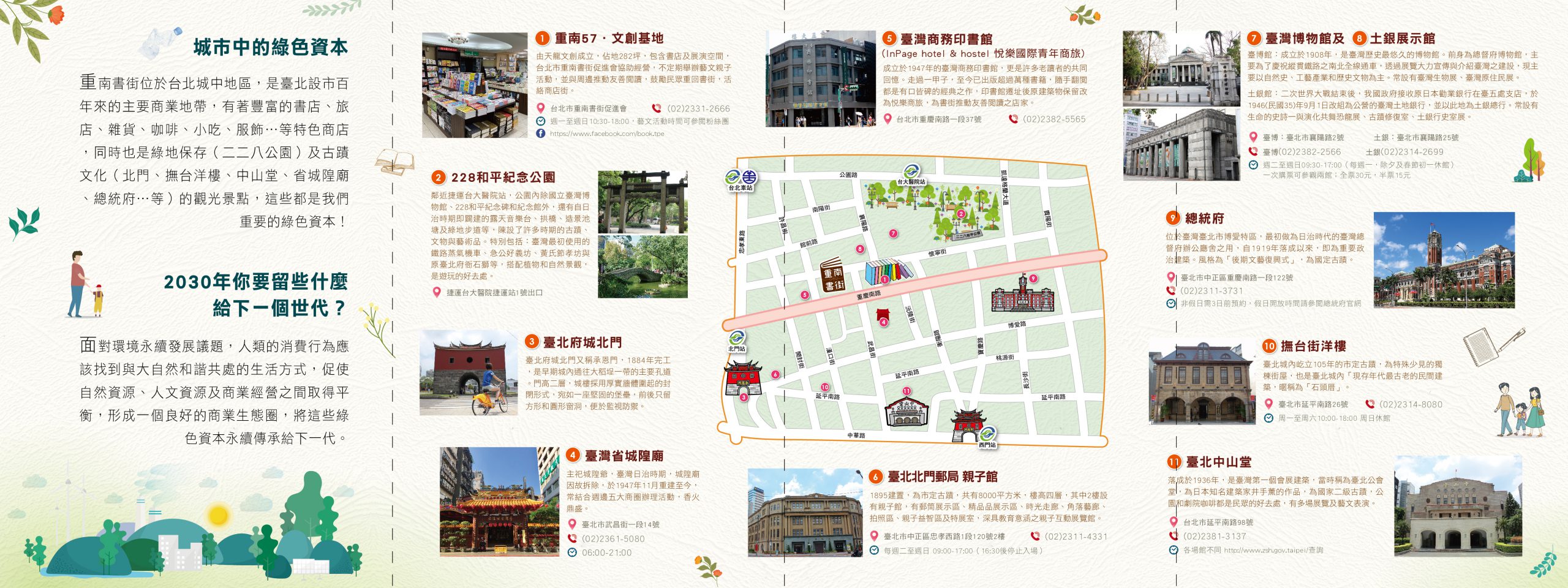 重南書街位於台北城中地區,是臺北設市百年來的主要商業地帶,有著豐富的書店、旅店、雜貨、咖啡、小吃、服飾…等特色商店,同時也是綠地保存(二二八公園)及古蹟文化(北門、撫台洋樓、中山堂、省城隍廟、總統府…等)的觀光景點,這些都是我們重要的綠色資本!