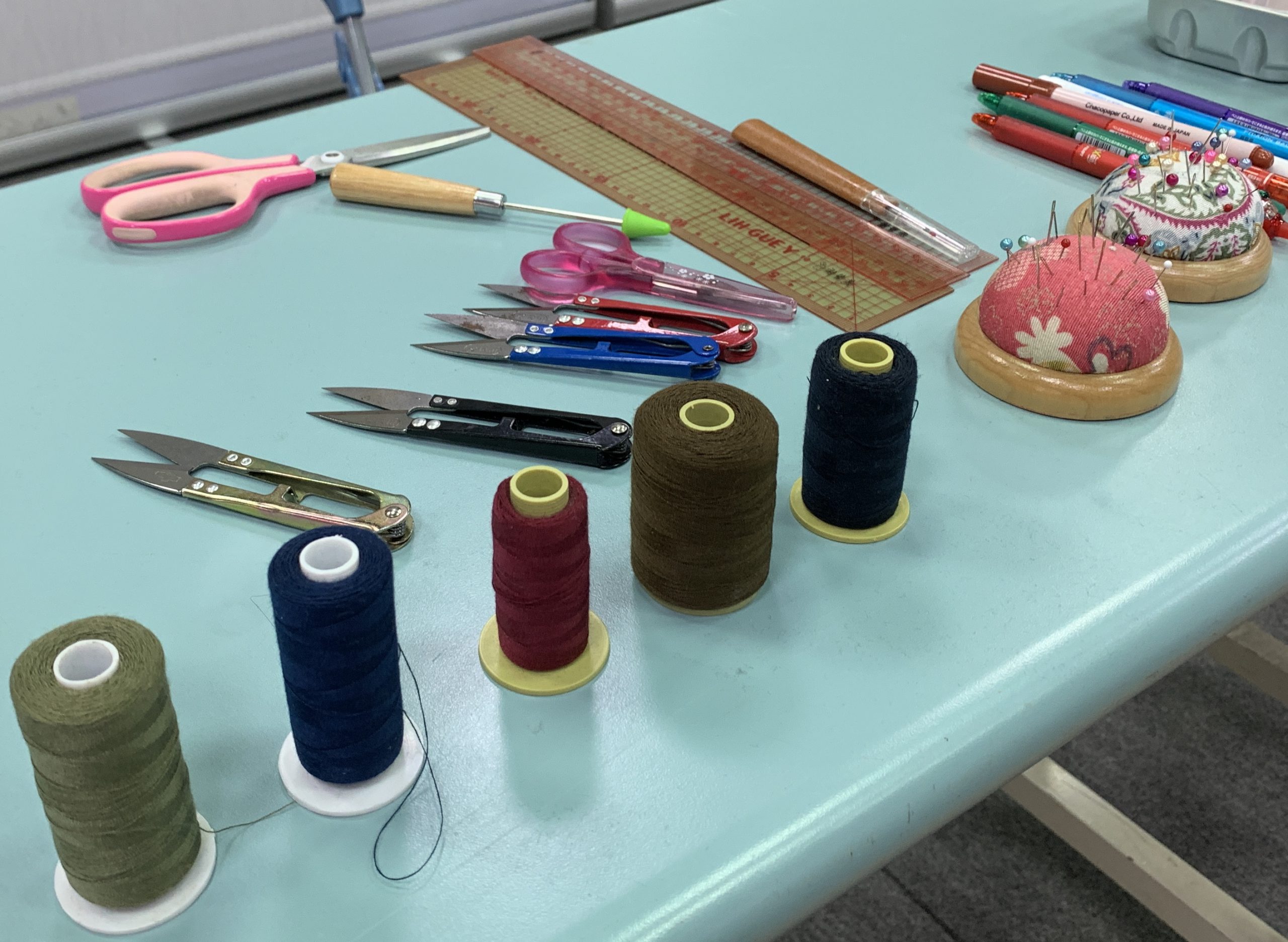 材料①:準備好針、線、剪線用的小剪刀、尺、鑽孔用的鑽頭。