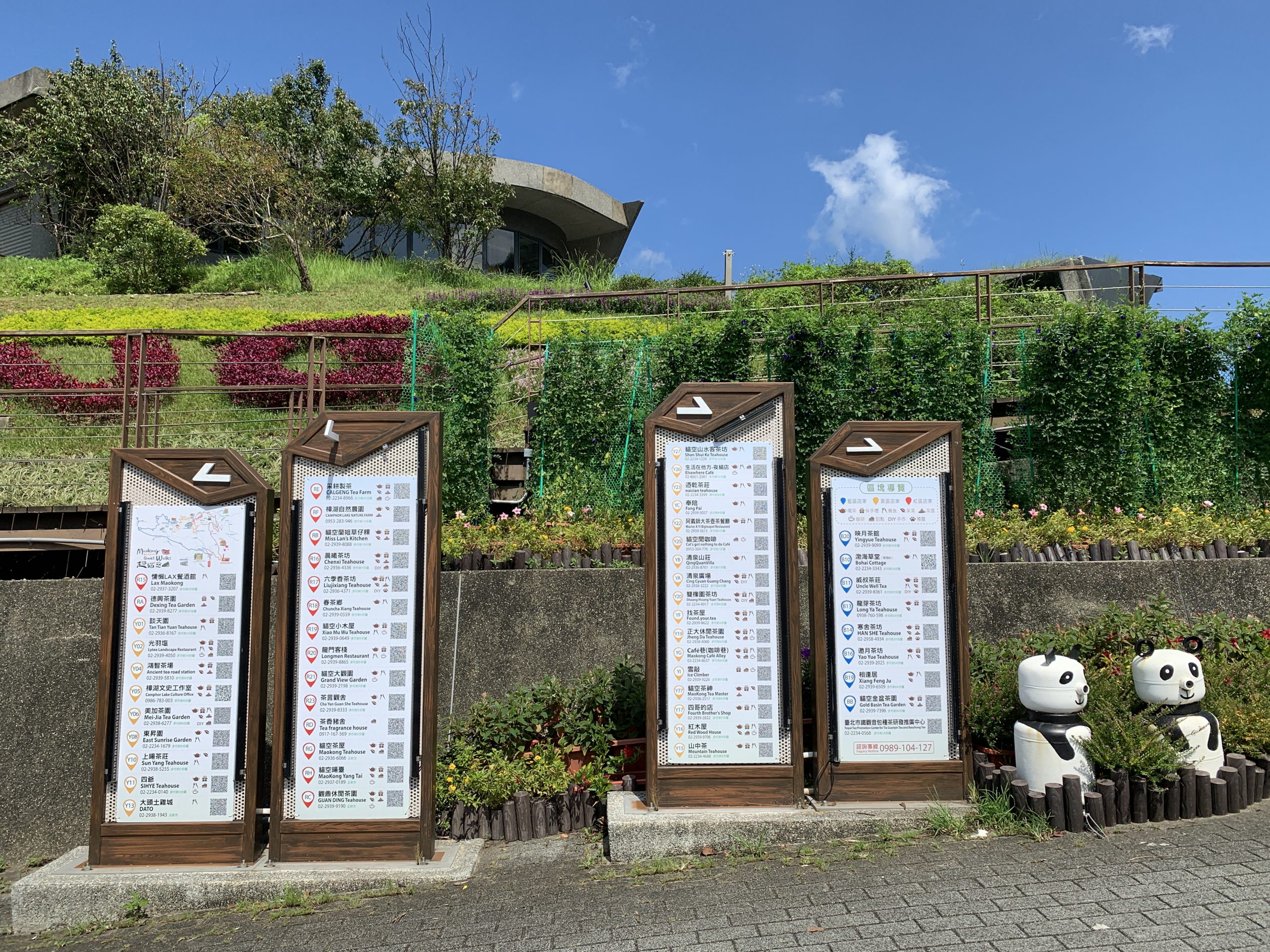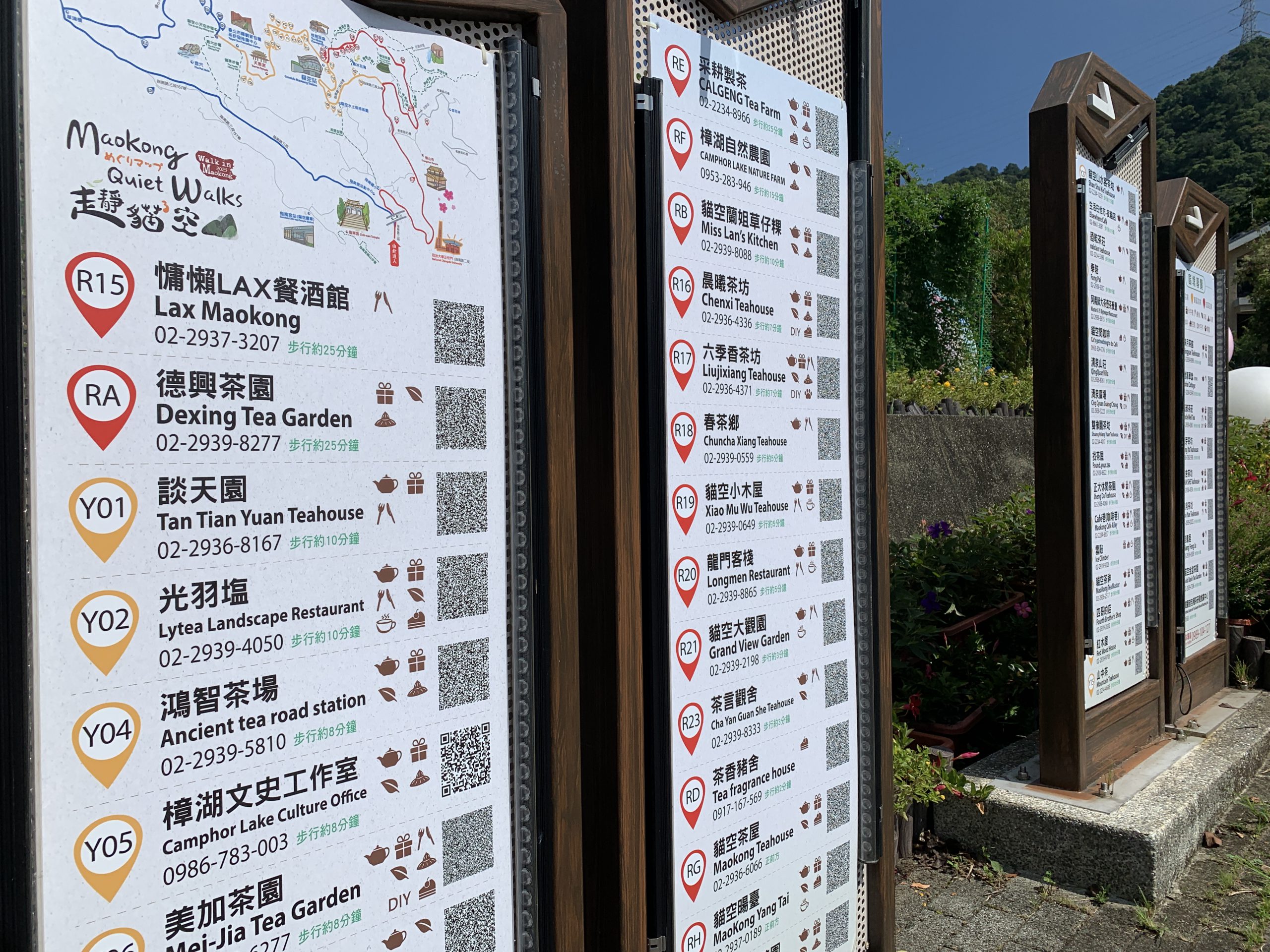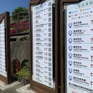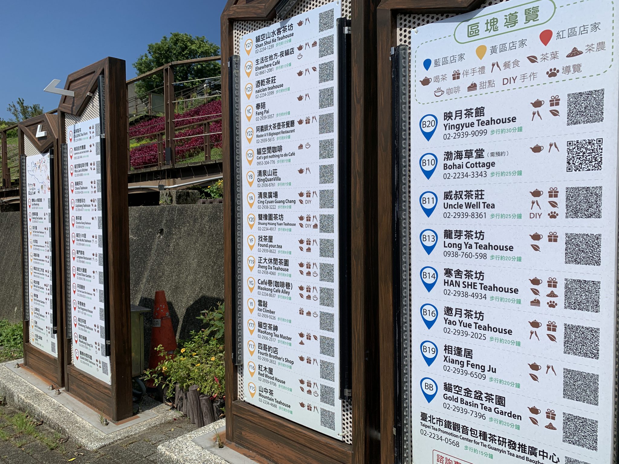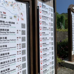 為了迎接國內外旅客的到來,延續走靜貓空智慧導覽地圖的設計,將貓空的50家店鋪資訊揭露於「貓空公車站旁的指示牌」上,並分成黃區(26家店鋪)、紅區(16家店鋪)、藍區(8家店鋪)三條路線展現出來。