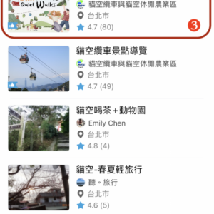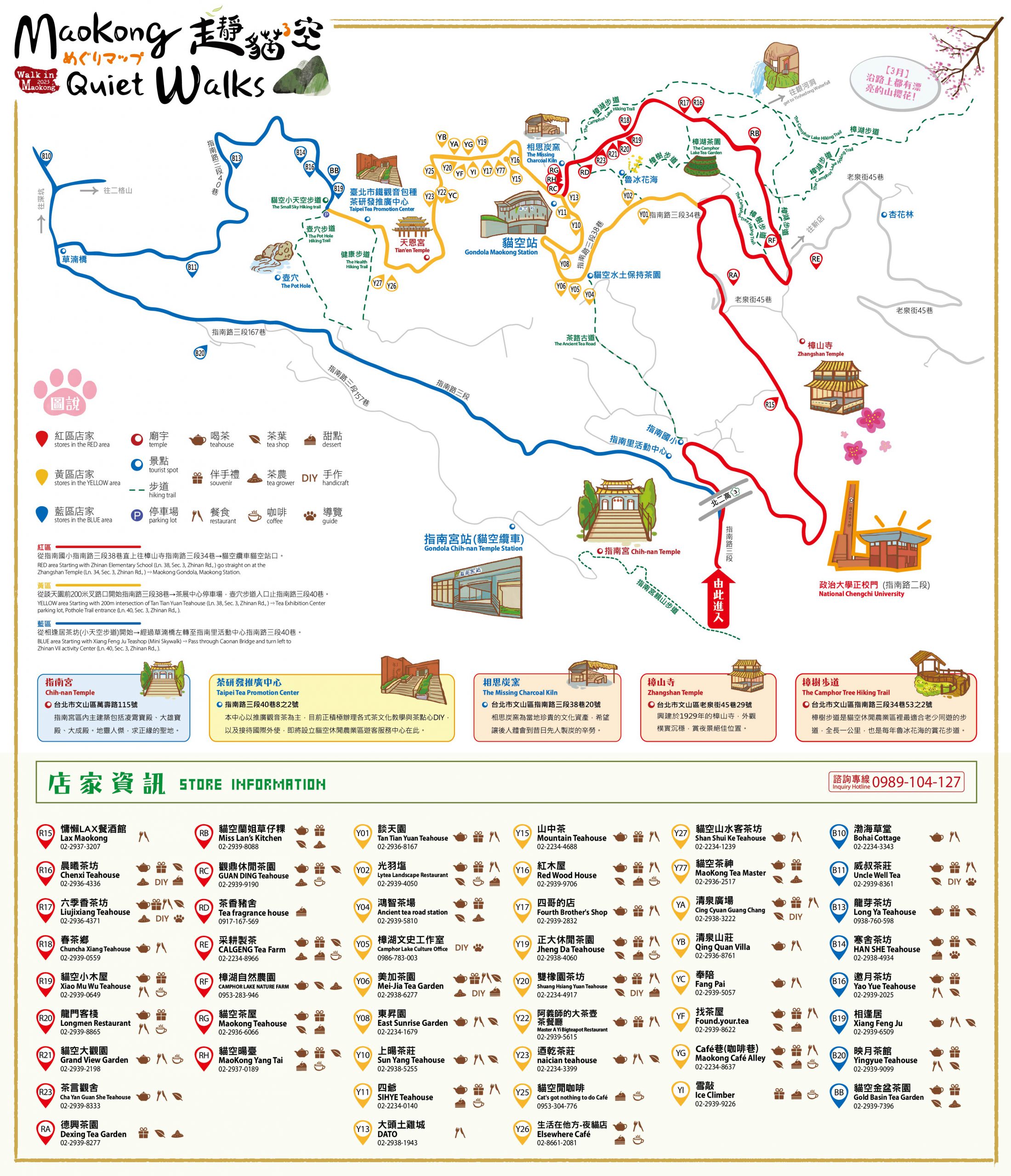 2023年9月,貓空商圈設計了新版的導覽地圖,將貓空的導覽路線分成三條:黃區(26家店鋪)、紅區(16家店鋪)、藍區(8家店鋪)。只要下載「蹦世界APP」,進入「走靜貓空 Maokong quiet walks」活動頁面,就可以讓手機幫你指路。