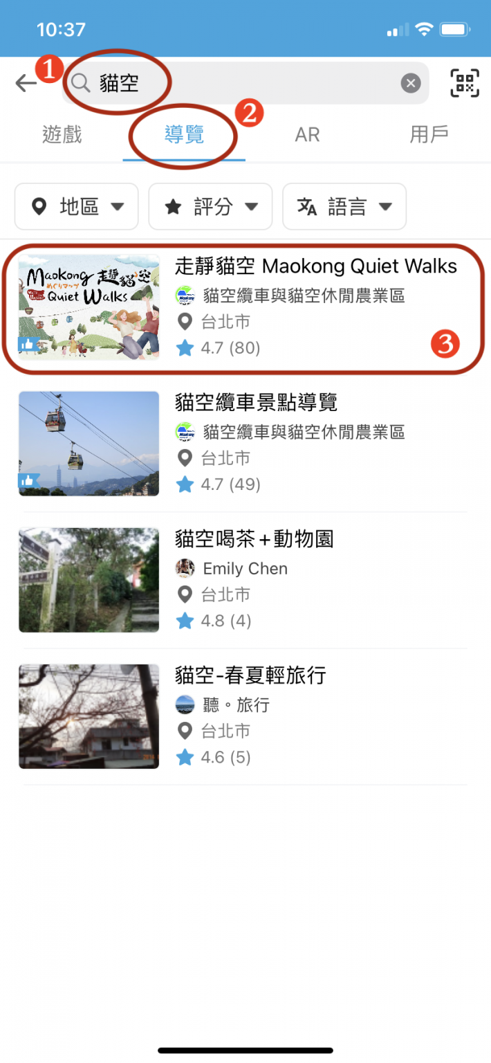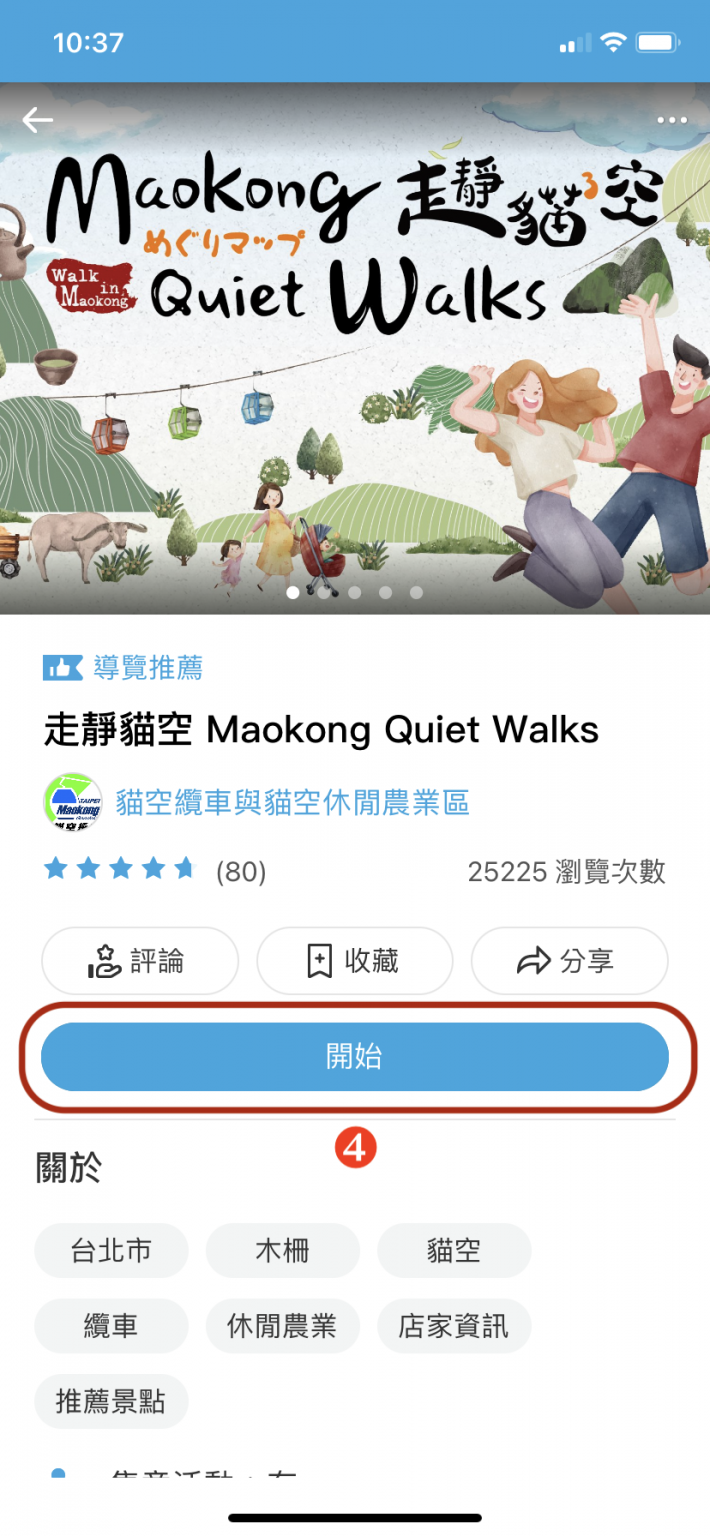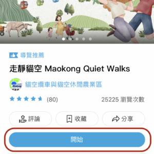 步驟 2:在蹦世界APP中搜尋「貓空」→ 點選「導覽」→ 找到「走靜貓空 Maokong Quiet Walks」後點進去活動。進入「走靜貓空 Maokong Quiet Walks」活動頁面,點選「開始」。(已經下載過APP的人,則會顯示「更新」,請點選「更新」。)