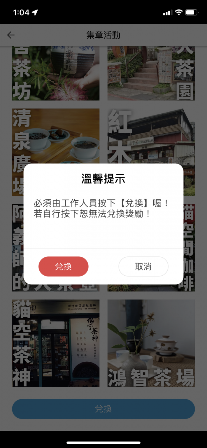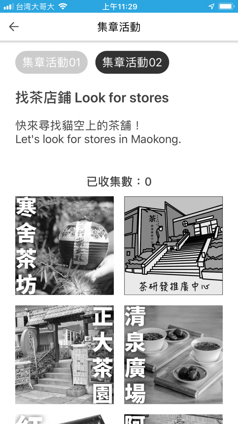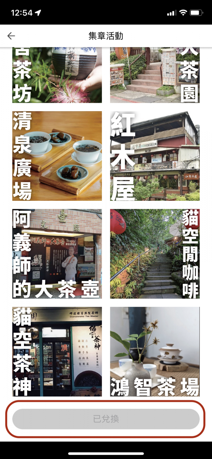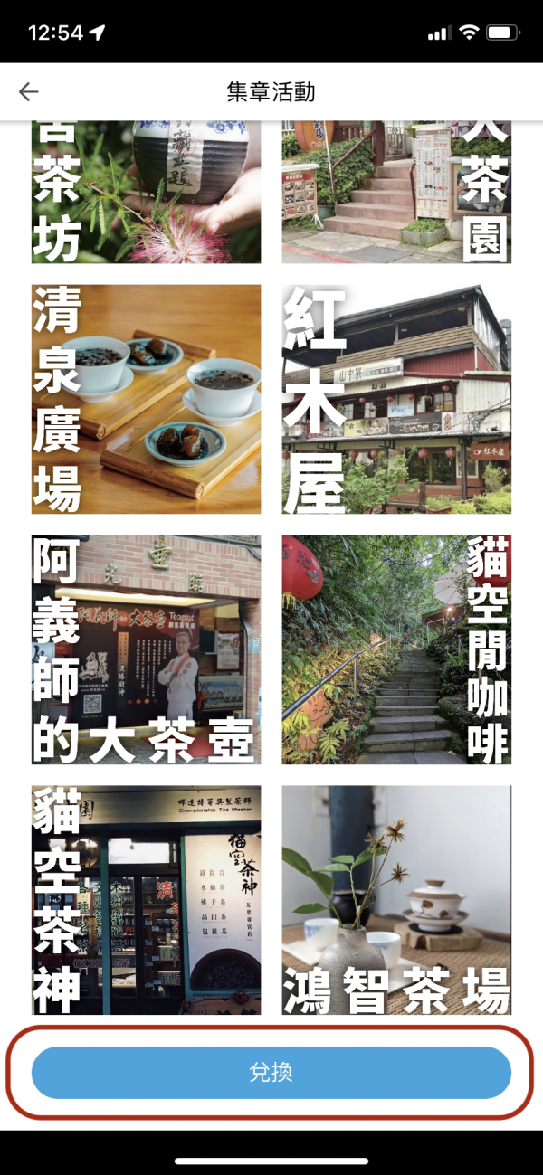 步驟 4:蹦世界APP的集章活動有兩個,「集章活動01」是尋找貓空上的旅遊景點,「集章活動02」是尋找貓空上跟茶有關的店舖。集章活動頁面最下方的「兌換」按鈕為「淺藍色」,代表您已經完成集章任務。