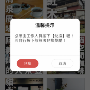 步驟 5:如果商圈有舉辦兌獎活動的話(要注意商圈的活動公告),可憑著兌獎畫面至指定地點進行兌獎。兌換時,請由店家的工作人員幫您按下紅色的兌換按鈕,並請您於店家的簽名表上簽名,確認已領取獎品。完成兌換後,原本下方淺藍色的兌換按鈕會反灰成「已兌換」。每支手機只能兌換一次,兌換完後就無法再兌換第二次,所以記得請店家的工作人員幫您按下紅色的兌換按鈕喔!
