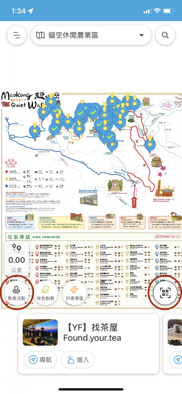 步驟 3:進入導覽地圖後,請開著APP的地圖畫面,前往貓空各店鋪,經過集章點即會自動感應,即可開始集章。如果沒感應到的話,請用APP裡的掃描功能,掃描店家門口的 QRCode 也可以立即集章。