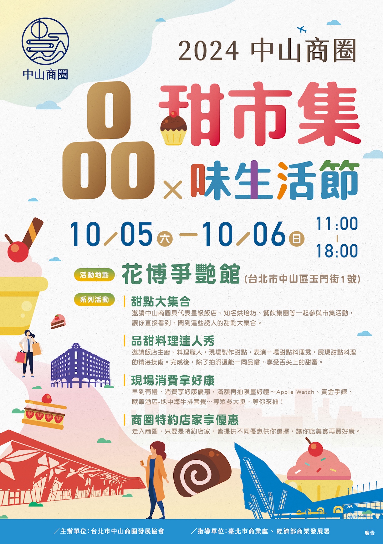 因此,本次設計採用平面式意象繪圖方式,將中山商圈內的著名建築物繪製出來,包括:歐華酒店、晶華酒店、圓山花博爭艷館、台北美術館、摩天輪…等,並以多元顏色展現中山商圈的購物、精緻、旅遊等意象。海報設計再加入今年的重點項目「品甜市集」,同樣以平面式意象繪圖強調「甜點」圖像,產生琳瑯滿目的感覺。