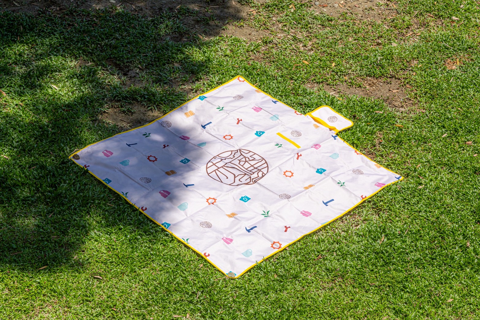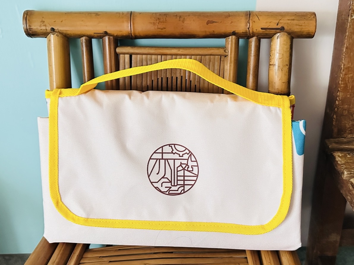 本次幫峰商圈設計這款野餐墊,用赤峰商圈的LOGO加上赤峰街當地的打鐵舊產業與文創新產業的意象圖,不規則地散佈成衣服畫。坐在上面野餐,就很像坐在畫布上一樣,搭配大自然的草地與青空,視覺效果相當搶眼。