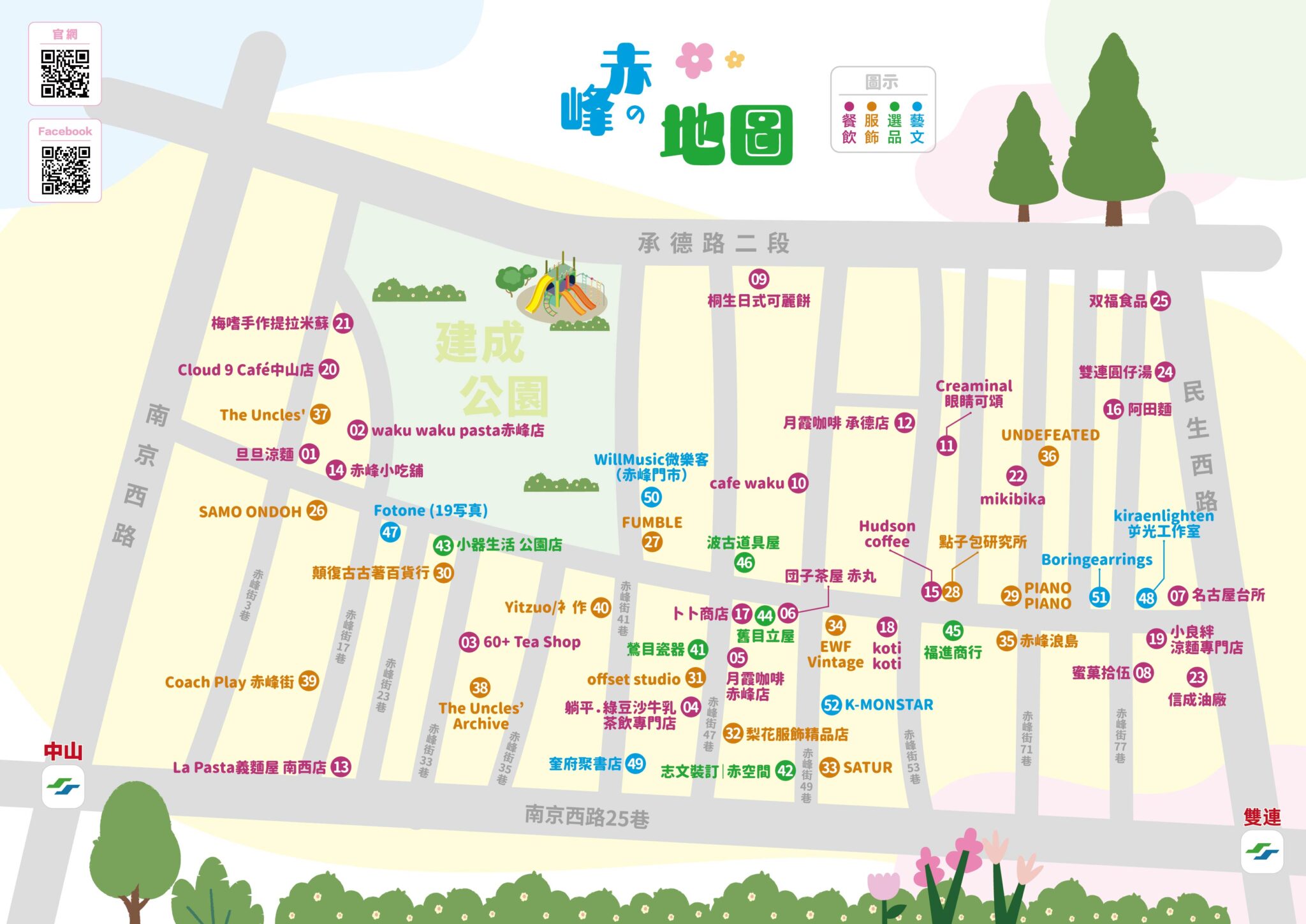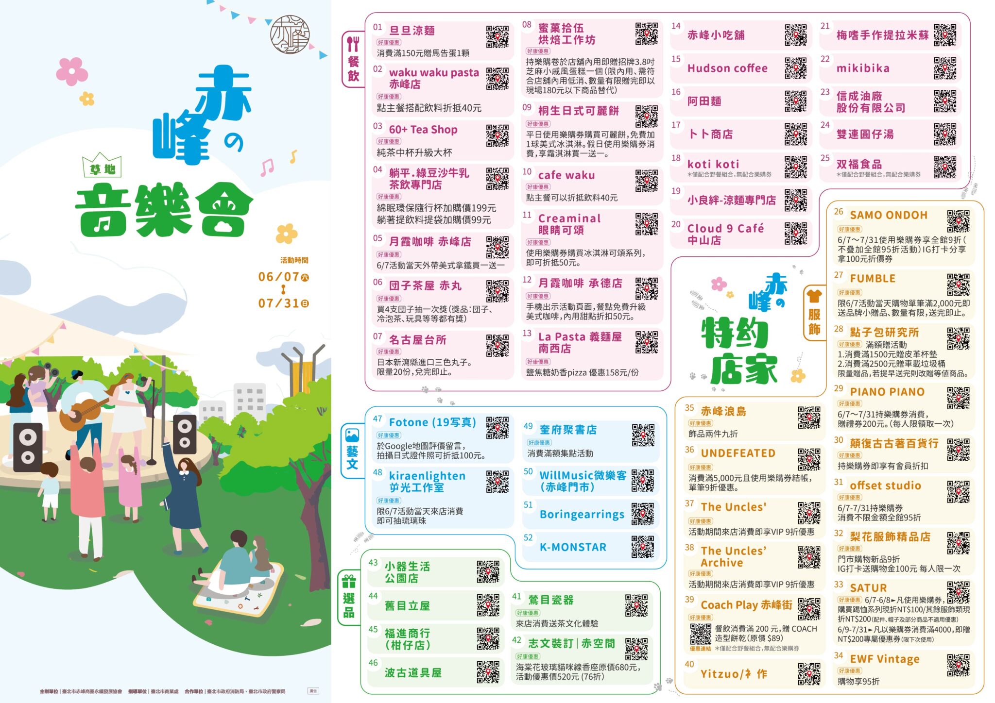 搭配2025「赤峰草地音樂會」及「赤峰青空野餐日」活動,設計店家巡禮地圖,提供遊客巡遊赤峰商圈的優惠資訊。赤峰商圈構成範圍為臺北市大同區光能里全域,由「心中山線形公園(捷運中山站~捷運雙連站)、南京西路、承德路二段、民生西路」所圍成的區域。主街為「赤峰街」,並由赤峰街及承德路二段之巷弄交錯分佈組成次要街道。