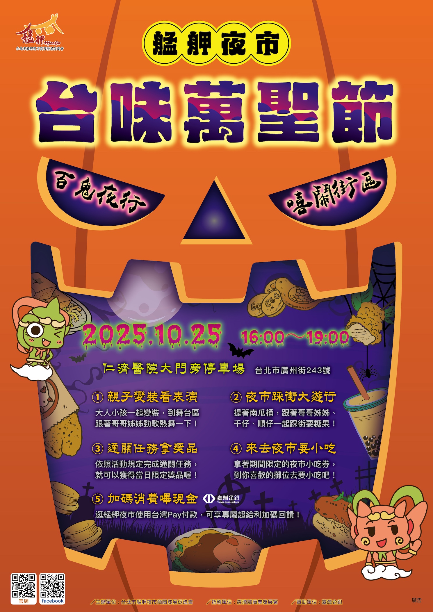 艋舺夜市台味萬聖節邁入第三年,以夜市的在地元素,結合西方的萬聖節,讓「夜市feat.萬聖節」,帶大家在夜市裡變裝遊行,向夜市攤位要糖果,還可以品嚐台味小吃,堪稱最具「台味」的萬聖節!今年的主視覺設計,以萬聖節的南瓜燈為基底,放上小吃插圖,象徵著艋舺夜市裡的小吃,加上吉祥物「千仔、順仔」,顯示出今年主活動將由千仔與順仔共同帶領大家遊行。